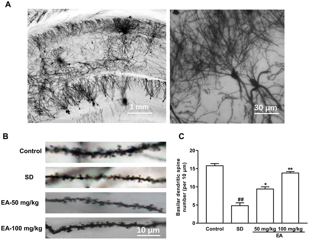 Figure 5. EA treatment reversed the spine density in the hippocampus area. (A) Golgi-Cox staining of CA1 pyramidal neurons for spine counting. (B) Representative images of basilar dendrites and (C) summary of spine counts from basilar dendrites. Data values were expressed as the mean ± SEM (n=3), ##P < 0.01 vs. control group; *P < 0.05 and **P < 0.01 vs. SD group.