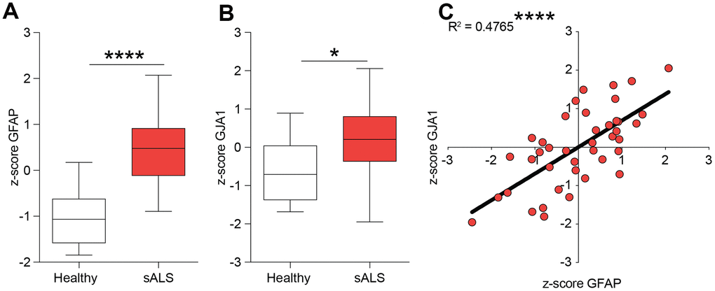 Figure 1. Expression levels of GFAP and GJA1 encoding for Cx43 in human sALS biopsies. (A, B) mRNA expression levels of GFAP (A) and GJA1 (B) in the central nervous system of sALS patients versus healthy control levels. Data are expressed as z-score intensity expression levels and presented via standard Box and whiskers plot. ****p-value < 0.0001 and *p-value < 0.05 versus healthy control group. (C) Linear regression analysis of GFAP and GJA1 z-scores in sALS group.