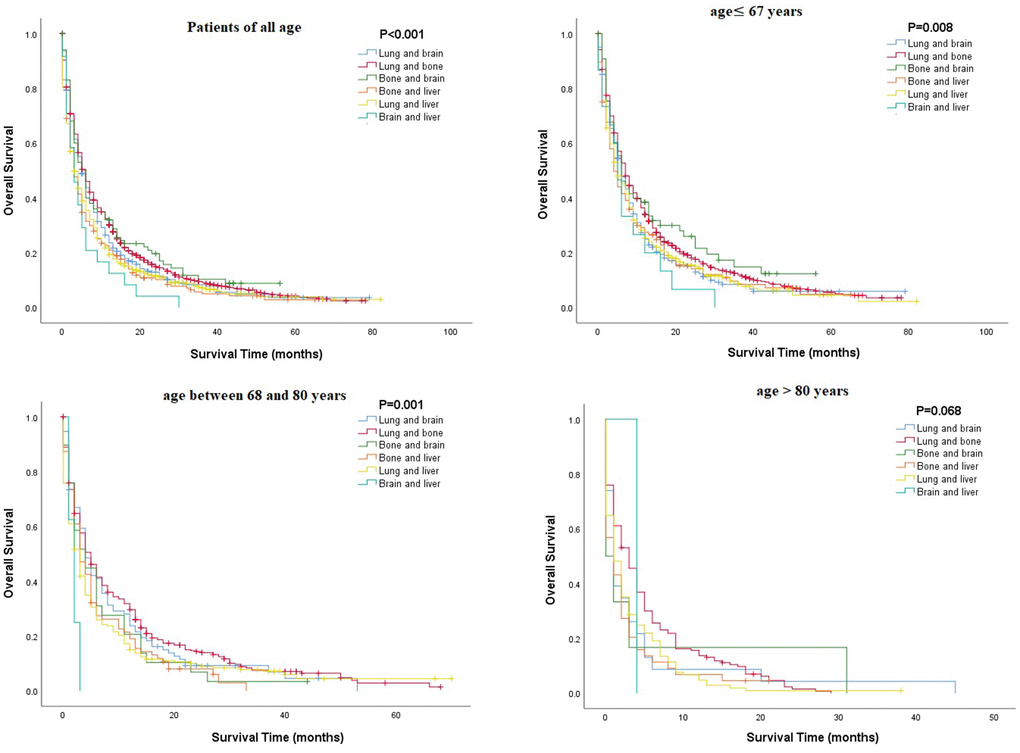 Multivariate Cox regression analysis of mRCC among different age groups revealed that several parameters, such as being unmarried, having a higher grade or N stage, and having metastasis (lung or brain), were associated with poorer OS in all age groups, while surgical resection or chemotherapy was associated with better OS (P<0.05, Table 3). Unlike other age groups, in the older group, being unmarried and male were related to poor OS (Table 3). Kaplan-Meier analysis was performed to compare the OS rates of patients with RCC and a single metastatic site in different age groups. The results showed that in all age groups, patients with metastasis to the lung or bone tended to have better OS, and those with metastasis to the liver had poorer OS (Figure 2). Moreover, Kaplan-Meier analysis for those with two metastatic sites indicated that patients with metastasis to the lung + bone and bone + brain had better OS than those with metastasis to the brain + liver (P<0.05, Figure 3).