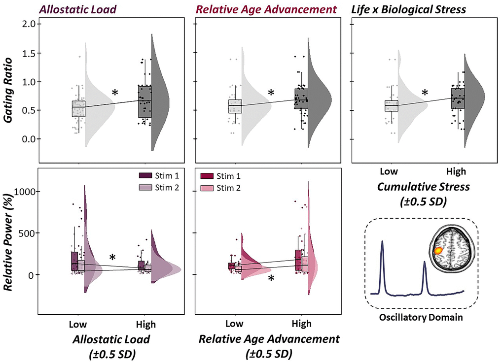 Figure 5. Life and biological stress differentially predict gamma oscillatory responses. (Top Panel): Multiple regressions of life stress (i.e., allostatic load, left), biological stress (i.e., relative age acceleration, middle) and their interaction (i.e., cumulative stress, right) on the gating of gamma activity in the primary somatosensory cortex were conducted. Raincloud plots (combined box plot, histogram distribution and individual scattered data points) denote somatosensory outcome metrics at low and high levels of each stressor (i.e., ±0.5 SDs). Life, biological and cumulative stress were all significant predictors of gating ratios, such that increased stress was associated with higher gating ratios, indicative of worse suppression of redundant sensory input. (Bottom Panel): Follow-up regressions of life and biological stress on neural response to stimulation 1 (darker color) and 2 (lighter color) in the paired-pulse paradigm revealed differential modulation of stimulation response based on stressor type. Allostatic load was significantly predictive of oscillatory responses to the first stimulation, such that higher levels of life stress led to reduced neural response to the first stimulation in the pair. In contrast, relative age acceleration was predictive of the oscillatory response to the second stimulation, such that greater biological age led to less attenuated response power to the second stimulation. All axes are fixed for each graph per row. *p < .05.